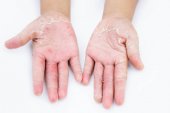 częściowy widok kobiecej ręki z suchą, złuszczoną skórą na niebiesko