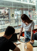 Piękna młoda azjatycka tajlandzka bizneswoman w czerwonej koszuli rozmawiająca z biznesmenami przed laptopem w sali konferencyjnej.
