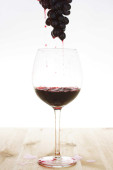 Czerwone wino wylewające się z czerwonych winogron, selektywne skupienie.