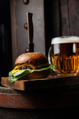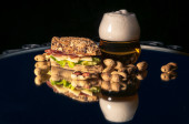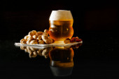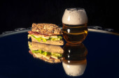 Szklanka piwa i kanapka z serem, kiełbasą i sałatką na serwetce są na szklanym stole z odbiciem na czarnym tle