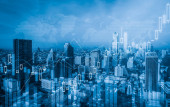 Zdjęcie "Hologram ikon mediów społecznościowych nad zachodem słońca panoramiczny pejzaż Bangkoku, Azja. Koncepcja powiązań międzyludzkich. Wielokrotne narażenie." może być wykorzystywane do celów osobistych i komercyjnych zgodnie z warunkami zakupionej licencji Royalty-free. Obraz jest dostępny do pobrania w jakości wysokiej rozdzielczości do 5760x3840.