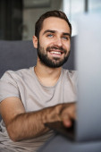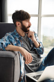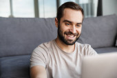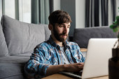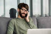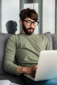 Obraz szczęśliwego brodatego mężczyzny w okularach uśmiechniętego i używającego notatnika siedzącego w salonie