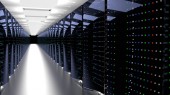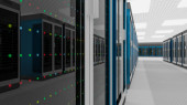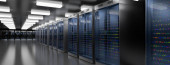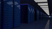 Stojaki serwerowe w centrum danych w chmurze serwerowni. Klaster sprzętowy Datacenter. Kopia zapasowa, hosting, mainframe, górnictwo, gospodarstwo rolne i komputer rack z informacjami o przechowywaniu. Renderowanie 3D. 3D ilustracja