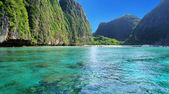 Piękna scena latem i przeznaczenia z górami i turkusowej wody morskiej w miejscowości Ton Sai Bay, region Phi Phi, Tajlandia
