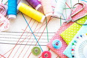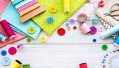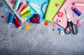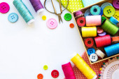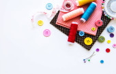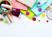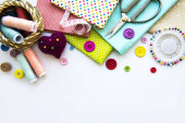 Akcesoria do szycia i tkaniny na białym tle. Nici, igły, szpilki, tkaniny, guziki i centymetr szycia. Widok z góry, płaski.