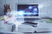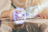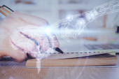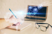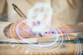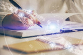 Wielokrotna ekspozycja kobiet piszących na tle technologii danych. Koncepcja innowacji.