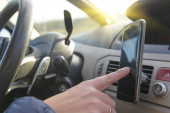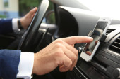 Panoramiczne ujęcie biznesmena korzystającego z samochodowego systemu audio