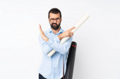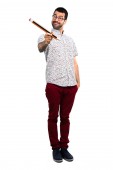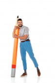Uśmiechnięty kujon z ręką na biodrze stojący w pobliżu dużego ołówka na białym tle