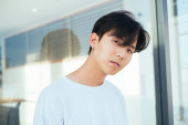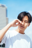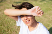 Nastolatek w białej koszulce, stojący na słońcu, podnosi rękę, by ukryć twarz..