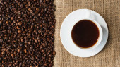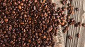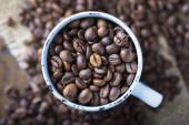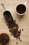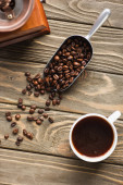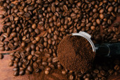 widok z góry mielonej kawy w portafilter na tle ziaren kawy