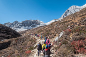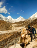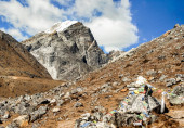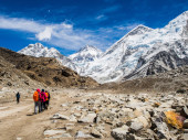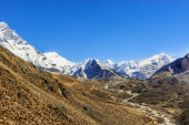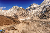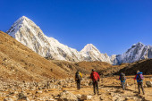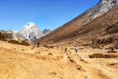 Zdjęcie "Widok na malowniczą dolinę, szczyty Himalajów i turystów na Everest Base Camp trek między Lobuche i Gorakshep" może być wykorzystywane do celów osobistych i komercyjnych zgodnie z warunkami zakupionej licencji Royalty-free. Obraz jest dostępny do pobrania w jakości wysokiej rozdzielczości do 5760x3840.