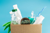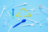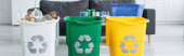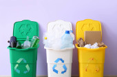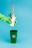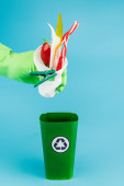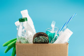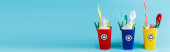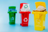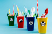 wielobarwne kosze na śmieci z tworzywa sztucznego na niebieskim tle