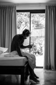 Przystojny mężczyzna w łóżku budzi się rano. Młody człowiek śpi.