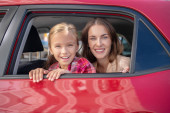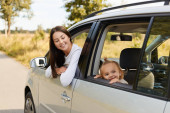 Selektywny skupienie podekscytowany matka i dziecko patrząc z dala podczas podróży w samochodzie