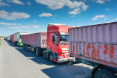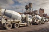 Przechowalnia dla samochodów ciężarowych na terenie terminalu zbożowego. Widok z góry. Fotografia lotnicza.