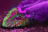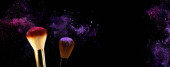 Ręka z jasnym manicure i pędzel na czarnym tle rozrzucone z musujących. Projekt paznokci. Wydłużone paznokcie.