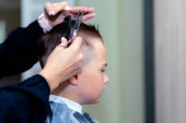 Mały uroczy chłopiec siedzi u fryzjera u stylisty, uczennica obcina włosy w salonie piękności, dziecko u fryzjera, krótka męska fryzura.