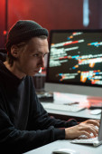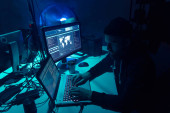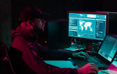 Oszustwa internetowe, Darknet, złodzieje danych, koncepcja cyberprzestępczości. Atak hakerów na rządowy serwer. Niebezpieczni przestępcy kodujący programy wirusowe w piwnicy.