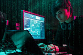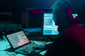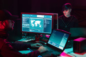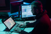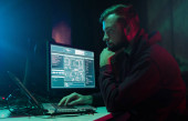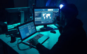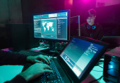 Zdjęcie "Oszustwa internetowe, Darknet, złodzieje danych, koncepcja cyberprzestępczości. Atak hakerów na rządowy serwer. Niebezpieczni przestępcy kodujący programy wirusowe w piwnicy." może być wykorzystywane do celów osobistych i komercyjnych zgodnie z warunkami zakupionej licencji Royalty-free. Obraz jest dostępny do pobrania w jakości wysokiej rozdzielczości do 5760x3840.