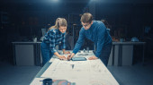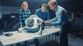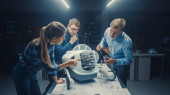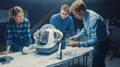 Zdjęcie "Robotyka Inżynieria Placówka Trzech Inżynierów Technicznych rozmawiać i pracować nad Wheeled Robot Prototyp. W tle High Tech Research Center z ekranami Wyświetlanie wzornictwa przemysłowego. Ciemny strzał" może być wykorzystywane do celów osobistych i komercyjnych zgodnie z warunkami zakupionej licencji Royalty-free. Obraz jest dostępny do pobrania w jakości wysokiej rozdzielczości do 5760x3840.
