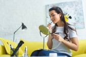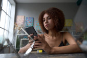 selektywna ostrość kręcone kobieta biorąc selfie w kuchni