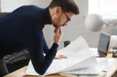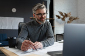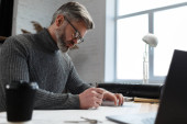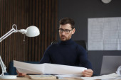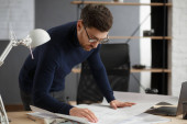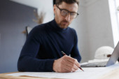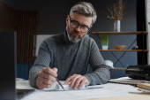 Zdjęcie "Architekt pracujący w biurze z planami projektowymi.Inżynier sprawdza plan architektoniczny, szkicując projekt budowy.Portret przystojnego brodatego mężczyzny siedzącego w miejscu pracy. Koncepcja budowy przedsiębiorstw" może być wykorzystywane do celów osobistych i komercyjnych zgodnie z warunkami zakupionej licencji Royalty-free. Obraz jest dostępny do pobrania w jakości wysokiej rozdzielczości do 5760x3840.