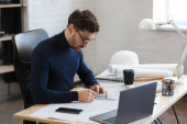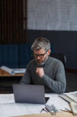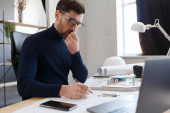 Architekt pracujący w biurze z planami projektowymi.Inżynier sprawdza plan architektoniczny, szkicując projekt budowy.Portret przystojnego brodatego mężczyzny siedzącego w miejscu pracy. Koncepcja budowy przedsiębiorstw