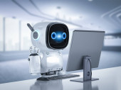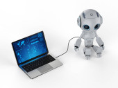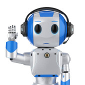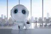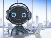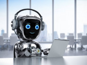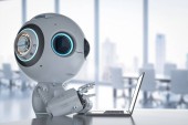 Automatyzacja koncepcji obsługi klienta z 3d renderowania cute robot pracy z słuchawkami i notebooka
