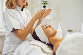 Zdjęcie "Kosmetolog sprawdzający elastyczność skóry i przeprowadzający badania na młodą, relaksującą kobietę" może być wykorzystywane do celów osobistych i komercyjnych zgodnie z warunkami zakupionej licencji Royalty-free. Obraz jest dostępny do pobrania w jakości wysokiej rozdzielczości do 5760x3840.