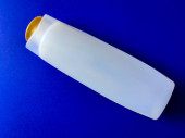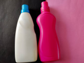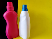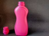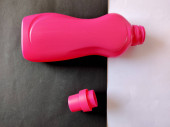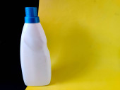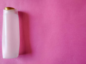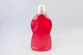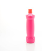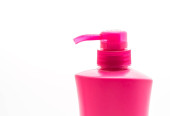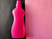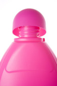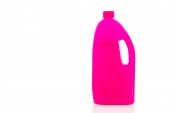 Wyświetlacz produktu. Różowy kolor butelki detergentu izolowane na czarnym tle.