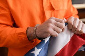 mężczyzna patrząc w kamerę podczas głosowania w pobliżu lokalu wyborczego z amerykańską flagą i napisem na niewyraźnym tle