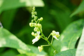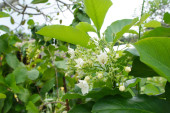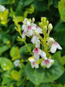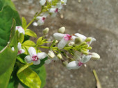 Kwiaty z delikatnymi białymi płatkami zewnętrznymi, czerwonymi płatkami wewnętrznymi, kwitnące w pęczkach. Wygląda znakomicie na zielonych liściach, bardzo pięknie.