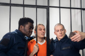 Zdjęcie "Aktorzy na planie filmu o więzieniu robią zabawne selfie w więziennej celi na tle barów." może być wykorzystywane do celów osobistych i komercyjnych zgodnie z warunkami zakupionej licencji Royalty-free. Obraz jest dostępny do pobrania w jakości wysokiej rozdzielczości do 5760x3840.