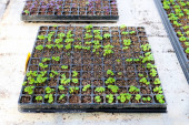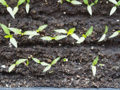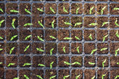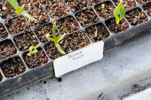 Wiersz nasion ogórka z etykietami rosnącymi w doniczkach.