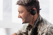 wojskowy człowiek w mundurze i słuchawki rozmowy, wskazując palcem