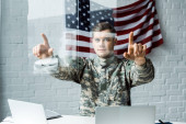 zły wojskowy człowiek w mundurze siedzi z zaciśnięty pięść obok laptopa na rozmytym tle