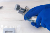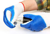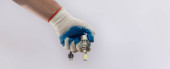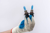 Ręka w rękawicy ochronnej trzymając żarówkę LED halogenowe, izolowane
