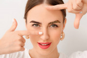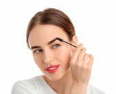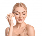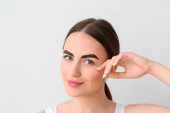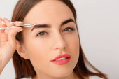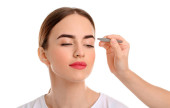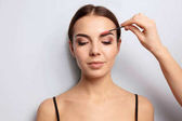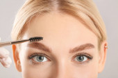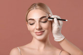 Młoda kobieta poddana zabiegowi korekcji brwi na tle koloru