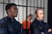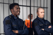 Zdjęcie "Ścisły strażnik więzienny w mundurach strzeże cel z więźniami w więzieniu o zaostrzonym rygorze." może być wykorzystywane do celów osobistych i komercyjnych zgodnie z warunkami zakupionej licencji Royalty-free. Obraz jest dostępny do pobrania w jakości wysokiej rozdzielczości do 5760x3840.