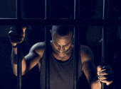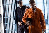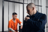 Ścisły strażnik więzienny w mundurach strzeże cel z więźniami w więzieniu o zaostrzonym rygorze.