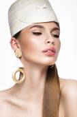 piękna blond kobieta z seksualny różowy kapelusz i kolorowy makijaż