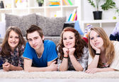 Grupa młodych przyjaciół, śpiewając karaoke w domu
