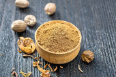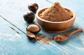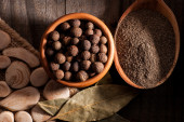 gałka muszkatołowa i mielona kawa na drewnianym tle