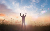 Chwała i uwielbienie koncepcji Boga: Sylwetka zdrowej kobiety podniósł ręce na chwałę i uwielbienie Boga na jesiennym tle łąki zachód słońca