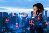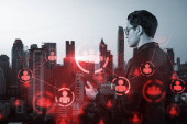 Atrakcyjny młody azjatycki dyrektor HR w międzynarodowej firmie myśli o rekrutacji wysoko wykwalifikowanych specjalistów. Kobiety w biznesie. Social media hologram ikony nad Bangkokiem.