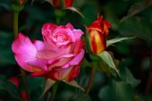 Czerwony pół-podwójny krzew róży w ogrodzie kwiatowym