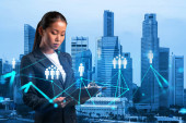 Zdjęcie "Uśmiechnięta czarna kobieta Dyrektor HR w międzynarodowej firmie myśli o rekrutacji wysoko wykwalifikowanych specjalistów. Kobiety w biznesie. Ikony hologramu mediów społecznościowych nad Kuala Lumpur." może być wykorzystywane do celów osobistych i komercyjnych zgodnie z warunkami zakupionej licencji Royalty-free. Obraz jest dostępny do pobrania w jakości wysokiej rozdzielczości do 5760x3840.