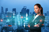 Uśmiechnięta czarna kobieta Dyrektor HR w międzynarodowej firmie myśli o rekrutacji wysoko wykwalifikowanych specjalistów. Kobiety w biznesie. Ikony hologramu mediów społecznościowych nad Kuala Lumpur.