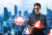 Zdjęcie "Atrakcyjny azjatycki dyrektor HR w międzynarodowej firmie poszukuje osobistego organizatora do zaplanowania spotkania biznesowego w celu rekrutacji wysoko wykwalifikowanych specjalistów. Ikony mediów społecznościowych nad Bangkokiem." może być wykorzystywane do celów osobistych i komercyjnych zgodnie z warunkami zakupionej licencji Royalty-free. Obraz jest dostępny do pobrania w jakości wysokiej rozdzielczości do 5760x3840.