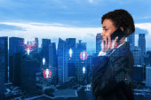 Atrakcyjny azjatycki dyrektor HR w międzynarodowej firmie poszukuje osobistego organizatora do zaplanowania spotkania biznesowego w celu rekrutacji wysoko wykwalifikowanych specjalistów. Ikony mediów społecznościowych nad Bangkokiem.